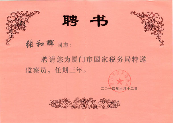 鹭达眼镜董事长张和辉被厦门市国家税务局聘为