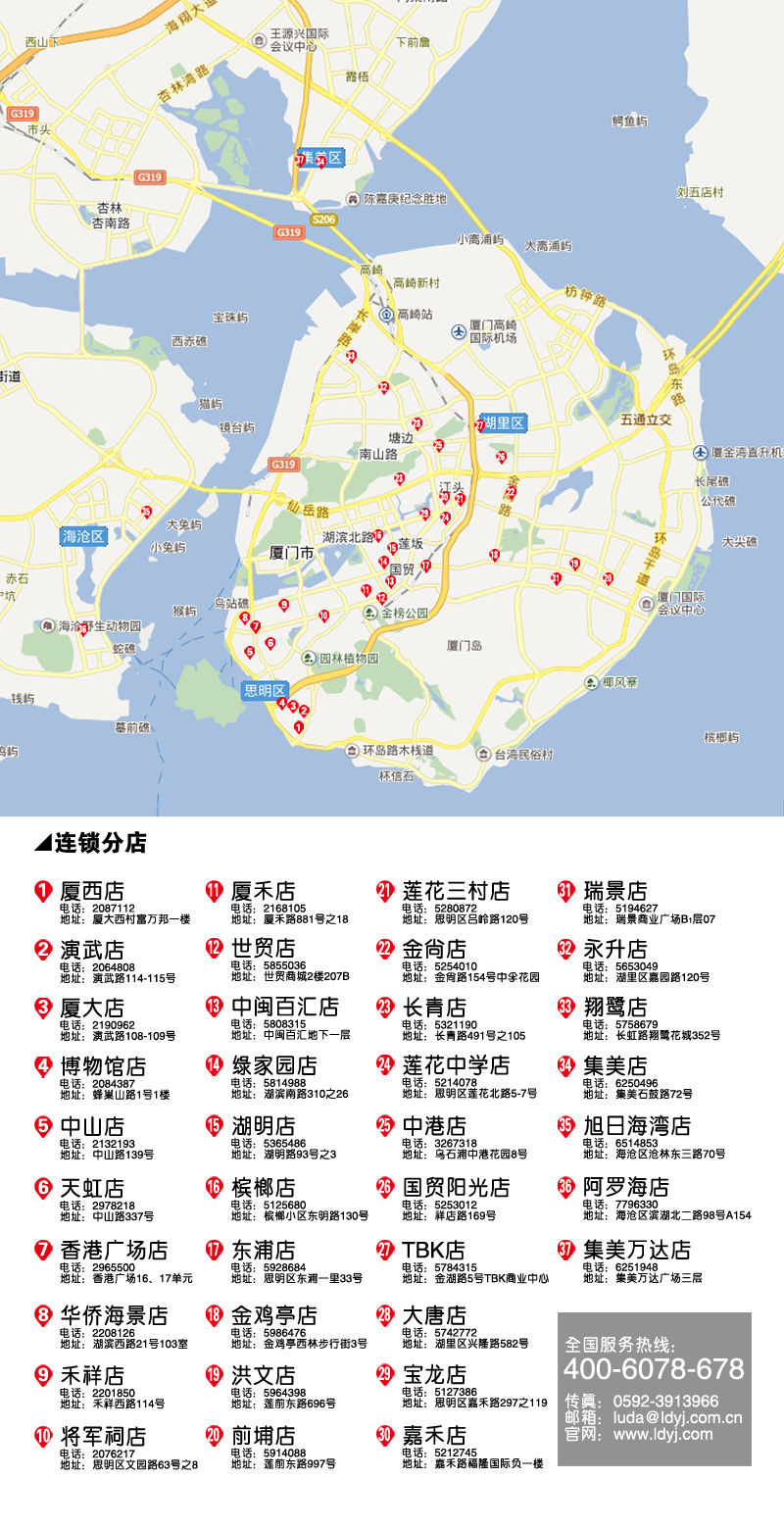 公司地址:厦门市思明区蜂巢山路1号3楼 邮政编码:361005 联系电话:0592-3913866 公司传真:0592-3913966 电子邮件:luda@ldyj.com.cn