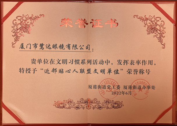 2022年6月2日,我司荣获厦港街道授予“近邻贴心人联盟文明单位”荣誉称号。