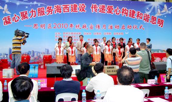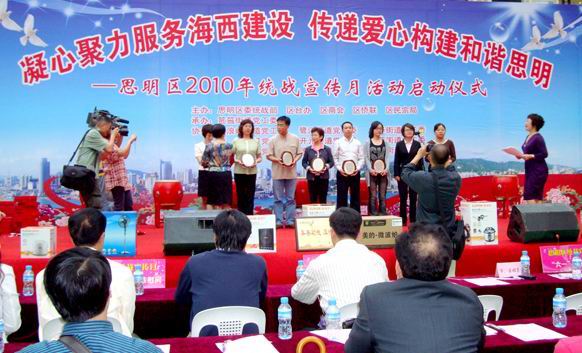 6月2日下午,由思明区委统战部组织的“凝心聚力服务海西建设,传递爱心构建和谐思明”暨思明区2010年统战宣传月活动启动仪式上,张董因关心和支持思明区社会公益事业,获得了“爱心人士”的称号。