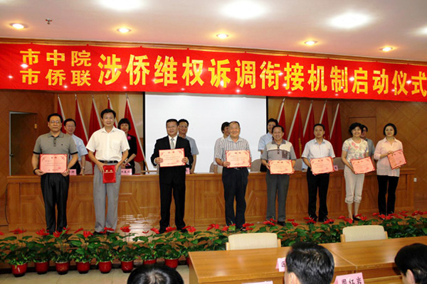 日前,厦门市侨联与厦门市中级人民法院举办了涉侨维权诉讼与非诉讼衔接互动工作启动仪式。启动仪式上,厦门市侨联党组书记、主席王德贤宣读了《厦门市中级人民法院、厦门市归国华侨联合会关于创建涉侨维权诉讼与非诉讼相衔接互动工作机制的决定》;厦门市委常委、市委统战部部长黄菱和厦门市侨联、厦门市中院领导为杨太极、邵谦和、张和辉等8名熟知侨情民意、掌握涉侨法律政策、具有独特经验和优势的侨界知名人员颁发了涉侨案件特邀调解员的聘书。